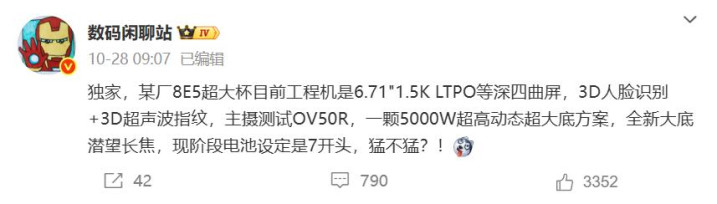 在解锁方面仍然有3D人脸识别+3D超声波指纹,机身配备金属中框、IP69顶级防水、玻璃后壳等,现阶段测试电池7000mAh以上,据了解会是超大杯中更大的,支持百瓦快充和无线充电,续航上值得期待。