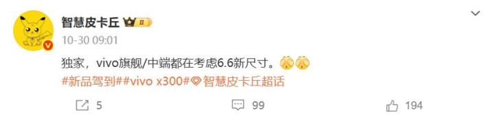 据博主智慧皮卡丘爆料,vivo旗舰系列也在考虑6.6英寸中尺寸,基本上锁定是vivo x300s了,本身今年x300就改为6.3英寸小屏,这次补齐中屏个尺寸都有了,选择性更广泛。