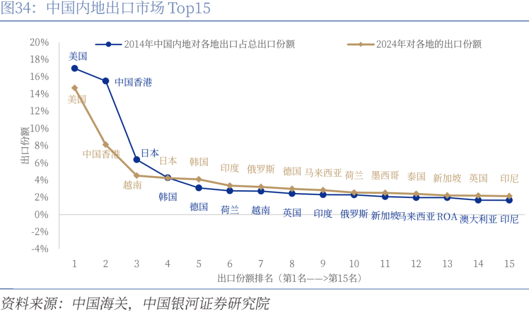 作为区域经济的重要引领者,中国始终秉持开放包容的发展理念,以更加积极主动的姿态推动区域贸易合作。在顶层设计层面,根据国家“十四五”规划的战略部署,中国正着力“构建高标准自由贸易区网络”,加快推进RCEP、中国-东盟自由贸易协定3.0等重大区域自贸协定的落地实施。同时,中国还将持续“推动商签更多高标准自由贸易协定和区域贸易协定”,为区域经济一体化注入新的动力。在贸易实践层面,中国与区域贸易伙伴间的通关效率、单证标准化等贸易程序优化指标呈现持续改善态势。通过对2014与2024年贸易数据的对比分析可见,我国出口市场格局已发生结构性调整:传统核心市场(美国、日本、韩国)在出口总额中的占比呈现明显下降趋势,东盟、俄罗斯、印度等市场增长尤为显著。依托自贸协定开拓新兴贸易市场成为当前阶段中国对外开放的主要方向。