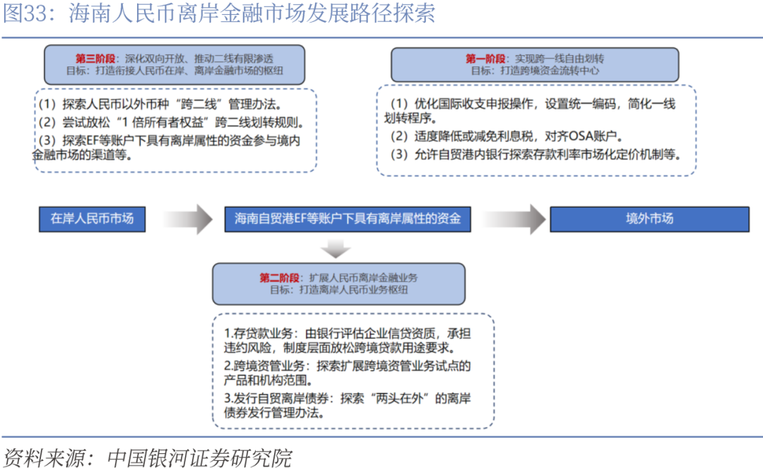第一,基于港内EF等账户的离岸属性,依托“境外—海南自贸账户—境内”的资金跨境通道,发展人民币离岸金融业务,打造中国境内人民币离岸金融中心。可按照“一线自由”、丰富人民币离岸业务场景、“二线有限渗透”的层次推进。其一,完善金融基础设施建设,聚焦优化离岸账户体系。当前EF账户作为海南及横琴地区特有的离岸金融工具,其核心功能在于构建境内外资金流动的规范化通道。然而实践表明,“一线自由”政策仍面临制度性约束,主要体现在国际收支申报环节。建议优化申报操作流程,通过设立标准化业务编码替代银行部门进行国际收支申报核查的程序,从而提升跨境结算效率,充分发挥离岸账户体系的制度优势。此外,适度降低或减免EF账户的利息税,对齐OSA账户,降低账户使用成本;逐步放开市场化存贷款利率的探索机制,允许自贸港内金融机构探索存款利率市场化定价机制等。其二,基于以EF账户为核心的离岸账户体系重点扩展海南人民币离岸金融业务的种类与规模。存贷款业务是最为基础的离岸金融业务种类,但当前贷款仍需遵循“三个办法”规则(流动资金,并购贷款,固定资产管理办法),不符合三个办法的贷款需求无法通过审批,随着跨境业务类型的多元化,大量新兴领域的贷款需求不断增长,建议由银行评估企业信贷资质,承担违约风险,制度层面放松跨境贷款用途要求。此外,建议探索扩展跨境资管业务试点的产品和机构范围,以推动跨境资管业务规模增长;参考上海自贸区实践经验,探索“两头在外”的离岸债券发行管理办法,扩展离岸债券业务。其三,双向开放深化期,扩展“跨二线”有限渗透的渠道与机制,形成与在岸金融市场的良性互动。基于EF账户现行规则制度下建议从以下方面,一方面,探索人民币以外币种“跨二线”管理办法。另一方面,放松EF账户与境内账户的划转额度“1 倍所有者权益”跨二线划转规则,探索EF等账户下具有离岸属性的资金参与境内金融市场的渠道,循序渐进推动在岸与离岸金融市场的衔接。