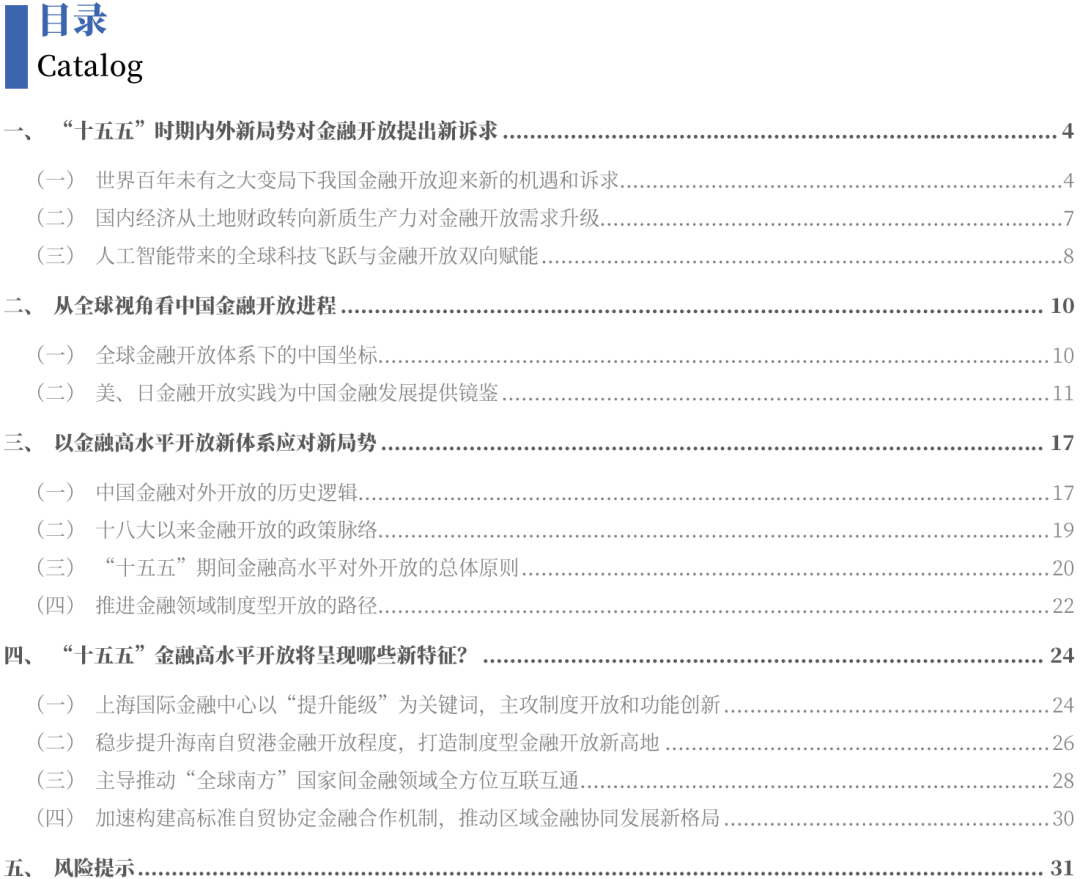 以金融高水平开放新体系应对新局势:基于国内外三大新局、国际经验借鉴以及中国金融开放的历史逻辑和政策演进,“十五五”期间金融高水平对外开放或将锚定“三个更”的建设目标:(1)更好助力建设更高水平开放型经济新体制(2)更有效统筹国内外金融资源赋能新质生产力发展(3)更系统防范科技安全隐患与新型金融风险的传导机制。以制度型开放为重点推进金融高水平对外开放将是实现上述目标的新路径。