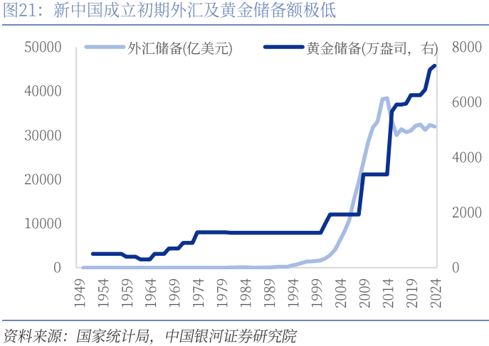 在新中国成立后的社会主义革命和建设初期,新中国金融系统进入重建和整合阶段,金融环境处于相对封闭状态。当时新中国百废待兴,在维护国家安全的前提下快速建立工业化基础,集中力量发展重工业,推动新现代化建设起步是当时社会经济的核心任务。与之相配合,社会生产要素、消费品等物资基本采取计划分配的形式,从而在社会资源有限的情况下“集中力量办大事”。金融资源同样采取“高度集中”的调配模式,市场化及开放程度极低,一是银行是金融系统的主要组成,管理架构高度集中,形成由中国人民银行总行统揽银行等存贷款金融机构的集权管理体制。二是形成由央行集中管理的利率决定机制。三是实施严格的外汇管理体制。建国初期,我国外汇及黄金储备额极低,黄金储备长期低于5百万盎司,外汇储备仅1亿美元左右,外汇收入均须交售给中国银行,按照国家计划调配拨付,人民币汇率运用行政机制进行严格管控。