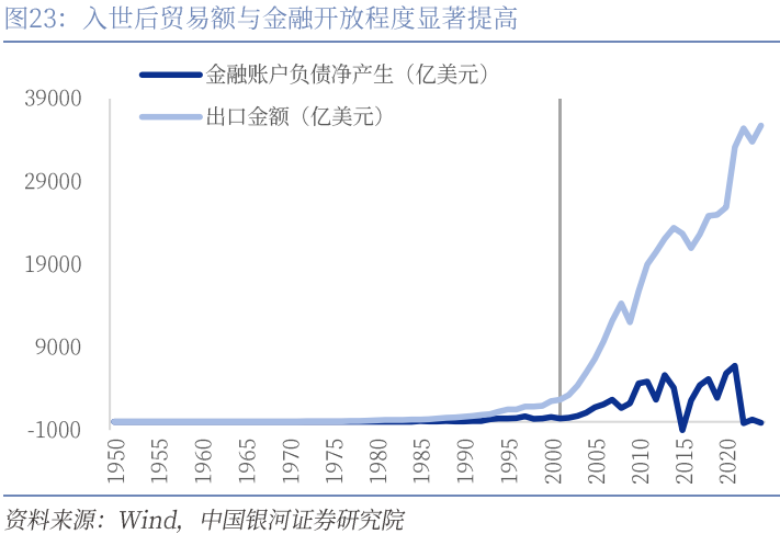 这一阶段是中国资本市场开放的起步期,也是制度性限制集中松绑的关键时期,背后逻辑在于响应国家经济发展需求、应对国际局势变化。第一,加入世贸组织是中国发挥劳动力和市场优势,嵌入早期国际分工体系的重要战略,以资本市场开放为筹码一方面能够满足入世要求;另一方面,扩大国内资本市场规模,引入国际评价标准,优化企业治理结构,提升企业经营管理水平。第二,当时,我国国际收支长期呈现经常项目与资本项目“双顺差”格局,西方国家据此指责我国操纵货币,对外输出通货紧缩,频频施压人民币汇率重估。“721”汇改是回应国际反对声浪、平衡国际收支、推动人民币国际化的必然选择。