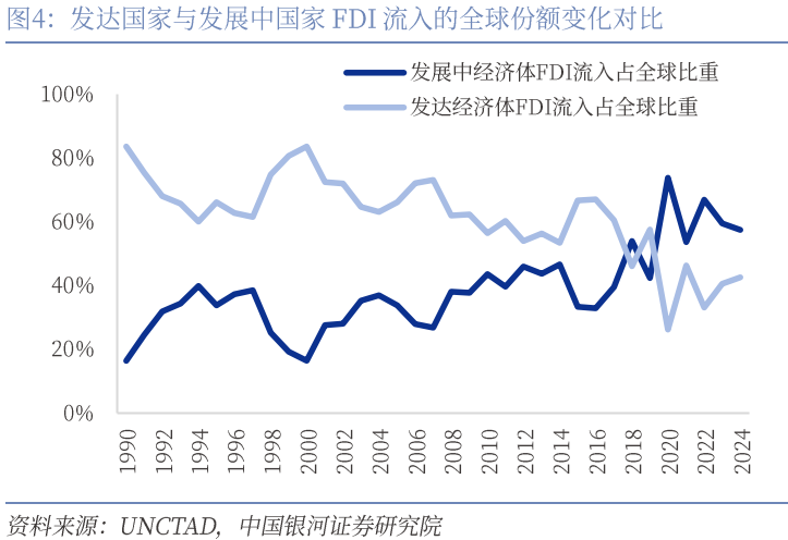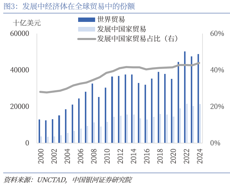 “全球南方”国家成为全球重要力量,加强与南方国家的经贸和金融合作将成为未来的重要方向。一大批“全球南方”国家正步入发展的快车道。IMF数据显示,新兴经济体与发展中国家在全球GDP的份额从2000年的21.02%上升至2024年的41.23%,预计到2029年将达到43.71%,且其经济增速显著高于发达经济体。一方面,“全球南方”在国际贸易和投资中的份额持续攀升,我国在加强与其经贸往来和产业链衔接的过程中,需要高水平的金融开放给予支持。南方国家不断融入全球贸易和供应链网络。2000年至2024年,发展中经济体在全球贸易中的份额从28.11%上升至43.87%。许多南方国家和地区也成为全球资金流量的热门目的地,如东盟已连续三年保持发展中地区吸收外资最多的地位。其中,我国在南方国家间的贸易中也将发挥越来越重要的作用。想要推动市场深度融合,促进资源优化配置,需要与南方国家政府在融资支持政策、营商环境优化等方面同频共振。另一方面,“全球南方”正直接推动国际金融体系变革,中国有责任和能力持续发挥关键作用。例如,各国正在逐步减少对美元和SWIFT系统的依赖,人民币跨境支付系统(CIPS)覆盖范围越来越广。这些措施不断提升南方国家在国际金融交易和结算中的自主性。此外,金砖国家新开发银行、亚投行和亚洲基础设施投资银行等新型多边金融机构也正在强化“全球南方”在国际金融治理中的作用。我国需要积极推动和参与国际金融治理,增强我国与其他南方国家在全球金融事务中的代表性和发言权。