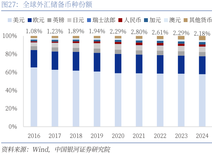 第二,把握全球货币体系重塑的窗口期推进人民币国际化有助于推动金融市场双向开放从而助力更高水平开放型经济新体制。人民币国际化是指人民币获得国际市场的广泛认可和接受,并发挥计价单位、交换媒介和价值储藏的功能,即成为国际结算货币、投入货币和储备货币。推动人民币国际化是金融强国建设的重要抓手,在国家发展战略规划中占据重要地位。“十二五”规划提出要“扩大人民币跨境使用”,“十三五”提出“有序实现人民币资本项目可兑换”“稳步推进人民币国际化”,“十四五”提出要“营造以人民币自由使用为基础的新型互利合作关系”。从跨境贸易结算到人民币跨境支付系统(CIPS)上线、加入国际货币基金组织的特别提款权(SDR)货币篮子,再到人民币离岸金融业务在上海临港新片区和海南自贸港等多地加快试点,人民币国际化的制度型壁垒在逐步降低,但相比于中国的经济与贸易体量,仍具有较大发展空间。尤其近年来受到新冠疫情及国内外经济局势变动的影响,人民币国际化进程存在放缓趋势,2024年人民币在全球外汇储备中的份额为2.18%,较2021年降低0.62%。