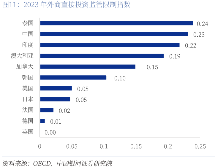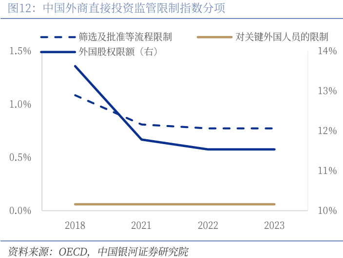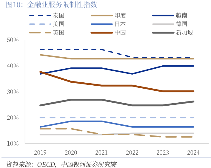 从指标数据来看,中国在金融业营商环境、服务限制及人民币国际化等方面取得较大进展,但资本账户自由流动方面还存在提升空间。第一,金融业营商环境及服务限制开放取得明显进展。OECD全球金融服务限制性指数聚焦外国投资准入限制、自然人流动限制、其他歧视性措施、竞争限制及监管透明度五大要素,采取赋予分值和权重的方式进行结果量化,主要侧重金融业营商环境及开放程度。该指标统计结果表明,近年来中国金融业的限制性指数呈现明显的下降趋势,成为全球范围内金融开放深化较明显的经济体。目前已显著领先于印度、泰国、越南等新兴市场,但与美欧日等发达经济体相比仍存在一定差距,这既是中国金融业发展的阶段性特征,也指明了未来深化改革开放的方向。第二,资本账户管制壁垒仍较高。外商直接投资监管限制指数重点测度FDI流动自由程度,统计结果表明,中国FDI限制壁垒仍然较高,与泰国、印度等经济体接近,较欧洲、美国、日韩存在较大差距。分项来看,中国外国股权限制、筛选和批准等流程限制均呈现下降趋势。