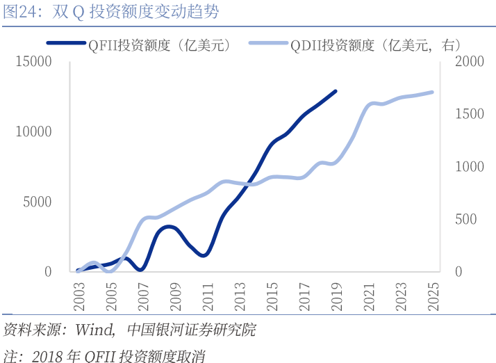 2001年,中国正式加入世界贸易组织,在削减关税壁垒等贸易条款之外,放开中国资本市场、外资金融机构准入等领域也是入世承诺的重要组成。2002年12月,《合格境外机构投资者境内证券投资管理暂行办法》正式实施,允许部分境外机构投资者在中国境内开展证券投资业务,2003年5月,瑞士银行成为中国首家获批的QFII,这是将中国资本市场纳入全球化资本市场体系所迈出的第一步。2006年《商业银行开办代客境外理财业务管理暂行办法》发布,正式确立QDII制度框架允许境内机构投资境外资本市场的股票、债券等。双Q制度实施以来,投资额度持续扩容。与此同时,其他金融开放探索也有序推进,2004年2月香港特别行政区开始开展人民币业务,人民币存款主要来自兑换及平盘业务。2006年3月,推出香港人民币支票业务。2007年,香港人民币债券开始发行,初步建成了内地与香港的跨境人民币清算体系。2005年“721”汇改拉开序幕,中国开始实行以市场供求为基础、参考一篮子货币进行调节、有管理的浮动汇率制度。