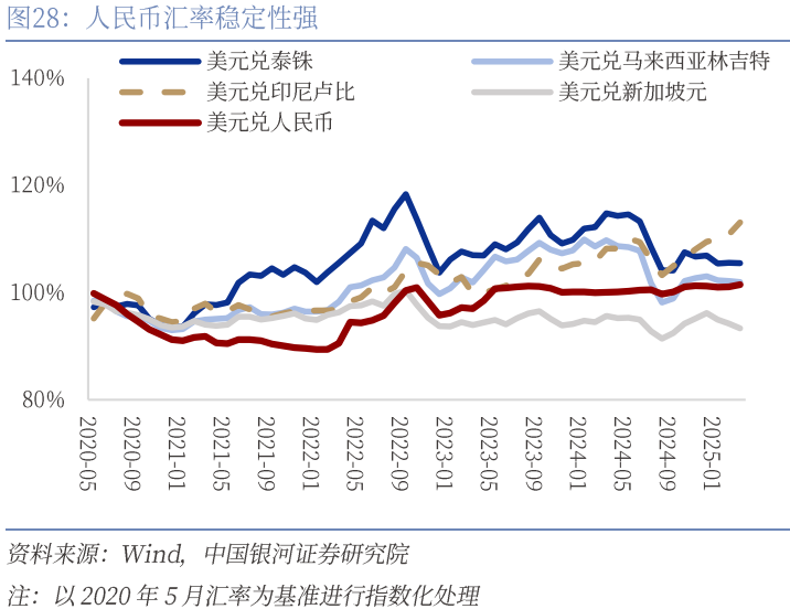 “十五五”阶段,随着美国政策不确定性风险的持续攀升以及债务可持续性的潜在危机,美元信用体系正面临空前挑战,国际资本的避险需求增长及“去美元”趋势为人民币国际化带来了新的契机。相比与亚洲其他货币,人民币的汇率波动相对稳定,或可成为国际资本避险投资的重要选择,未来通过拓展大宗商品人民币计价、发展离岸人民币债券市场等举措,有望进一步提升人民币资产的国际流动性与金融定价权,从而为更高水平开放型经济新体制提供助力。