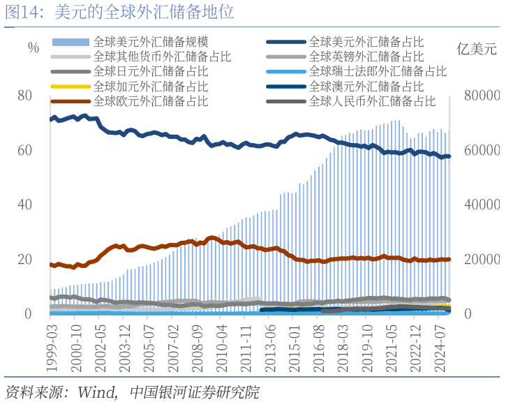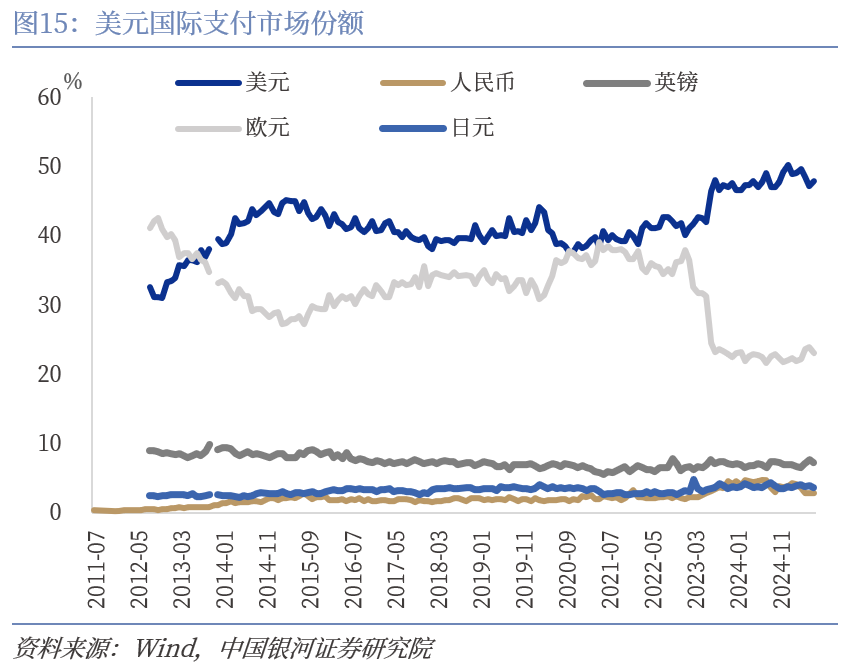 一是美元的国际地位奠定了美国全球金融主导角色。1944年,布雷顿森林体系确立,美国通过建立美元与黄金挂钩的货币体系,将美元确立为国际结算货币,为美元的国际地位奠定了基础。20世纪70年代布雷顿森林体系瓦解后,美国通过将美元与石油贸易绑定,全球石油交易强制使用美元结算,形成了新的金融全球主导机制。目前,美元的全球外汇储备地位以及国际支付市场份额虽有下降,但仍占据绝对主导。