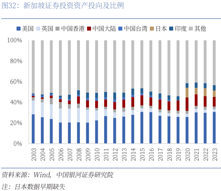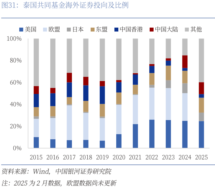 第二,提高对“全球南方”国家的服务能力。当前,东盟等新兴经济体经济增长强劲,凭借人口、资源等禀赋优势成为全球经济主要引擎,金融投资需求有望大幅增长。从东盟金融投资布局来看,泰国共同基金海外证券投资欧美地区(2024年合计份额为50.16%),但近年来呈现下行趋势。对中国大陆投资份额逐步上升,2024年增至11.58%。新加坡对华证券投资份额上升趋势明显,2019年起超过新加坡对外证券投资总额的10%。未来,依托中资金融机构的国际化服务网络,加强与全球南方国家主权基金、投资机构和企业的合作,推动投融资渠道多元化,扩大跨境人民币贷款、支付结算和国际银团规模,服务当地业务。